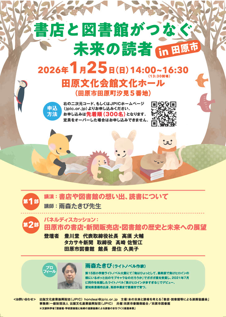 | 内容 | 【第一部】 講演 「書店や図書館の思い出、読書について」 講師 雨森たきび先生(ライトノベル作家) 【第二部】 パネルディスカッション 「田原市の書店・新聞販売店・図書館の歴史と未来への展望」 登壇者 豊川堂 代表取締役 高須大輔 タカサキ新聞 取締役 髙崎佐智江 田原市図書館 館長 是住久美子 |
