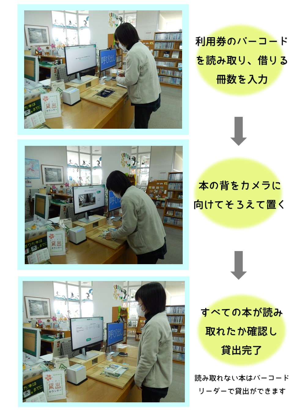 セルフ貸出は、本の背表紙画像を読み取ると複数の本を一括で認識して簡単に貸出処理を行います。 窓口の混雑時や窓口休止時間中(12時~13時)でも、セルフ貸出機を使って自分で貸出手続きができますので来館して体験してみてください。